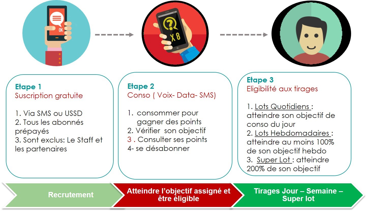 Les promo usage booster sont des campagnes d’incitation au rechargement/consommation au cours desquelles, les abonnés sont amenés à Recharger/consommer au-delà de leur niveau habituel pour atteindre leur objectif en vue d’être éligibles aux différents types de lots mis en jeu.